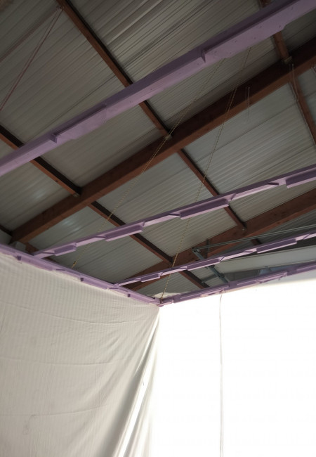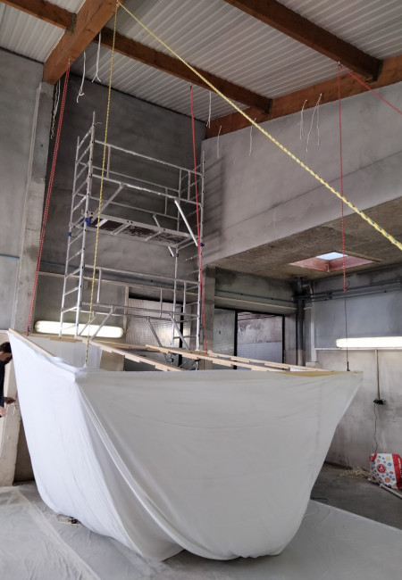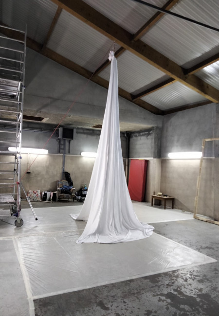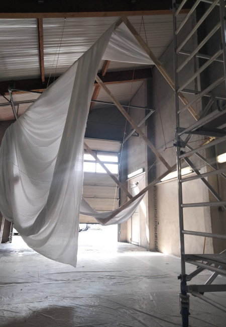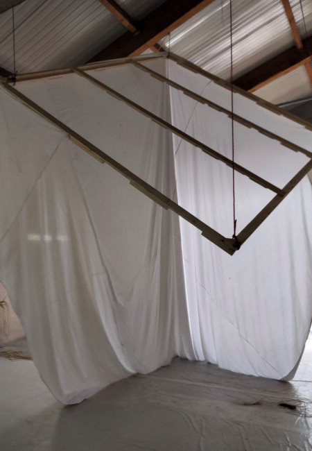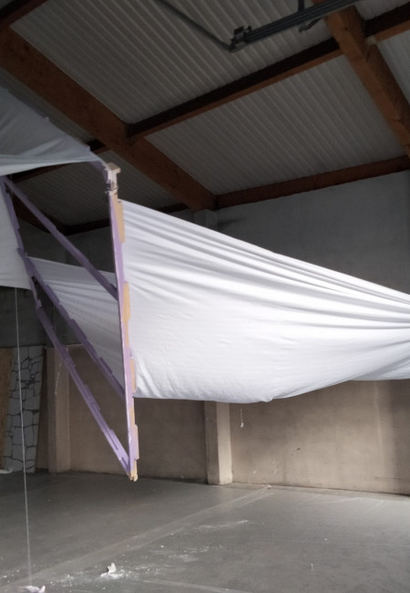 Dans cette pièce le châssis, n’est plus seulement un support de toile plane, il devient la base aérienne de la structure. Il semble porté par la sculpture qui est, quant à elle, amarrée par un maigre fil au sol. Le tissu plâtré de haut en bas, tient de lui-même. Une fois sous la structure, l’on peut apercevoir, par transparence, les gestes de construction manuelle . Ce projet joue avec les contrastes: une légèreté apparente pour une structure, en réalité lourde et solide; ou encore, l’existence complètement éphémère d’une pièce dont l’élaboration nécéssite un grand déploiement physique et technique.