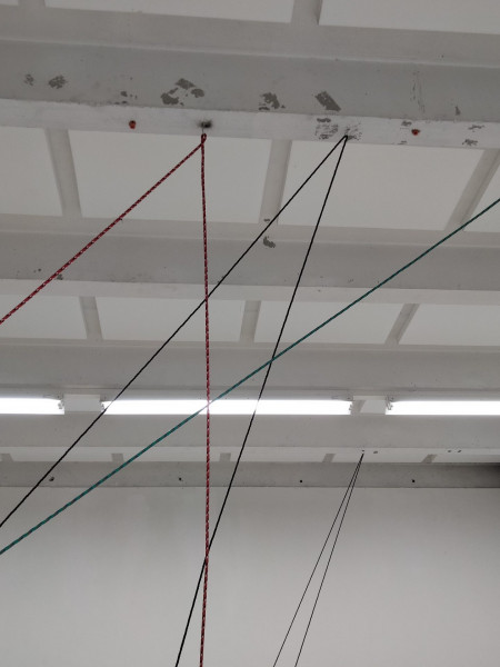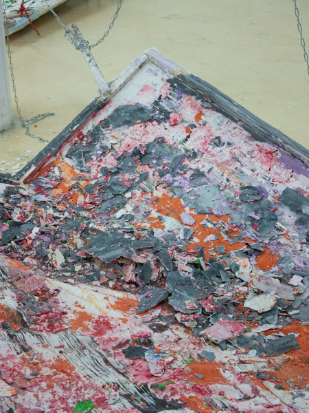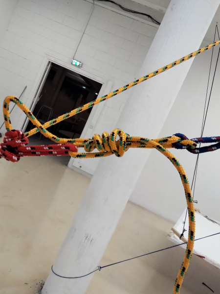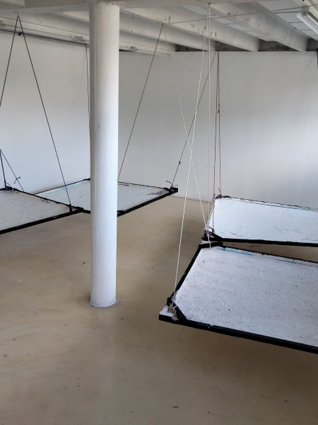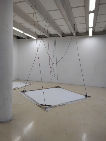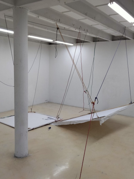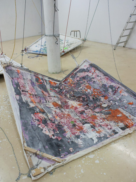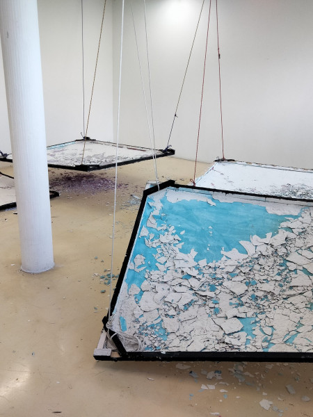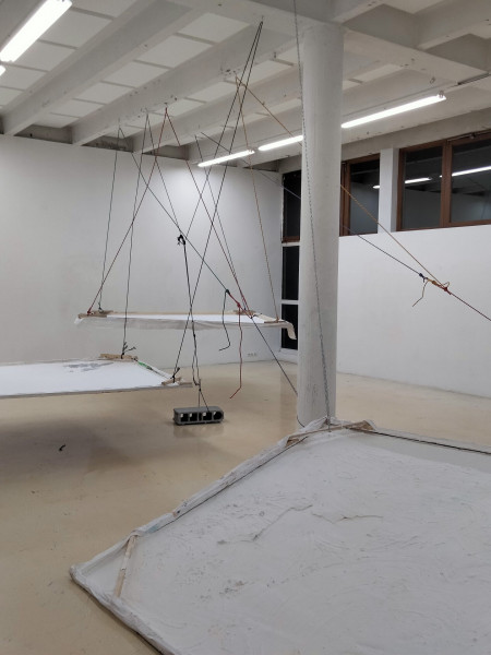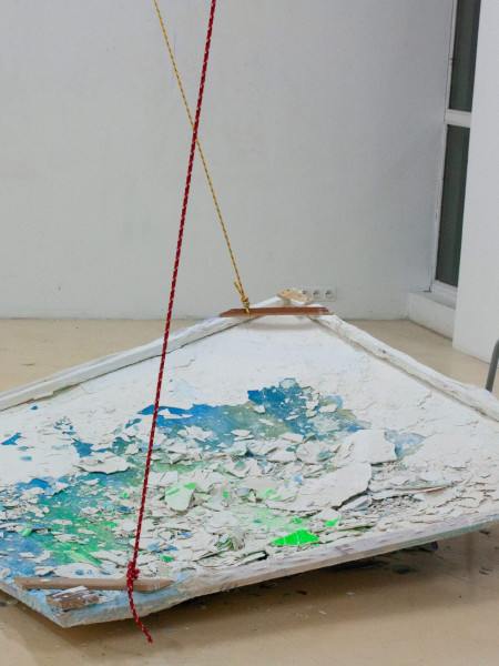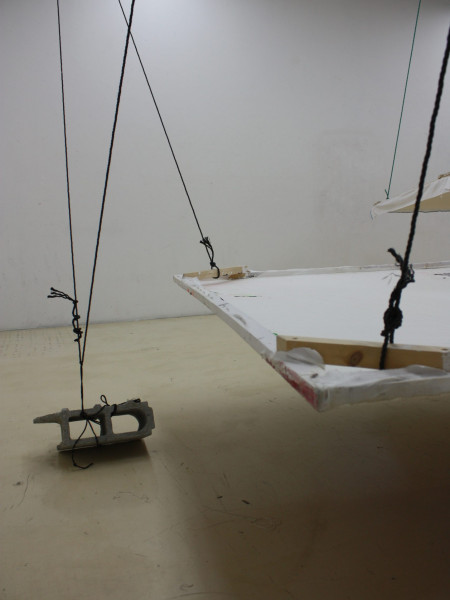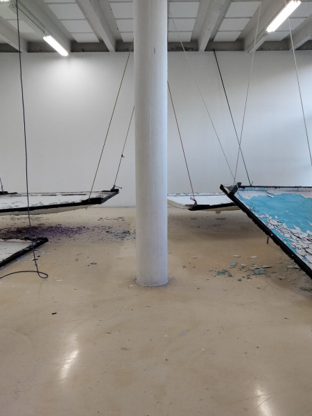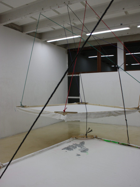 Avec le projet Strike The Plaster Hull, l’on distingue deux gestes; le geste du travail, dans l’effort de construction des toiles, puis le geste du performeur. Que relie ses deux chorégraphies? Cette installation met en avant cette limite entre le geste chorégraphique et le geste de construction, à travers un espace aménagé, pour questionner ces notions. La suspension permet de voir le dessus et le dessous des plateformes, et laisse apparaître toutes les couleurs sous le plâtre. C’est au moment du craquement, des premiers pas du performeur, que le travail réalisé sur les plateformes se dévoile, que les gestes de construction picturale apparaissent, comme témoins du corps en mouvement. La performance devient un outil, puisque par la destruction, l’on découvre une tout autre toile que celle de départ. Nous sommes alors face à une reconsidération de la toile de part son traitement et sa mise en valeur.